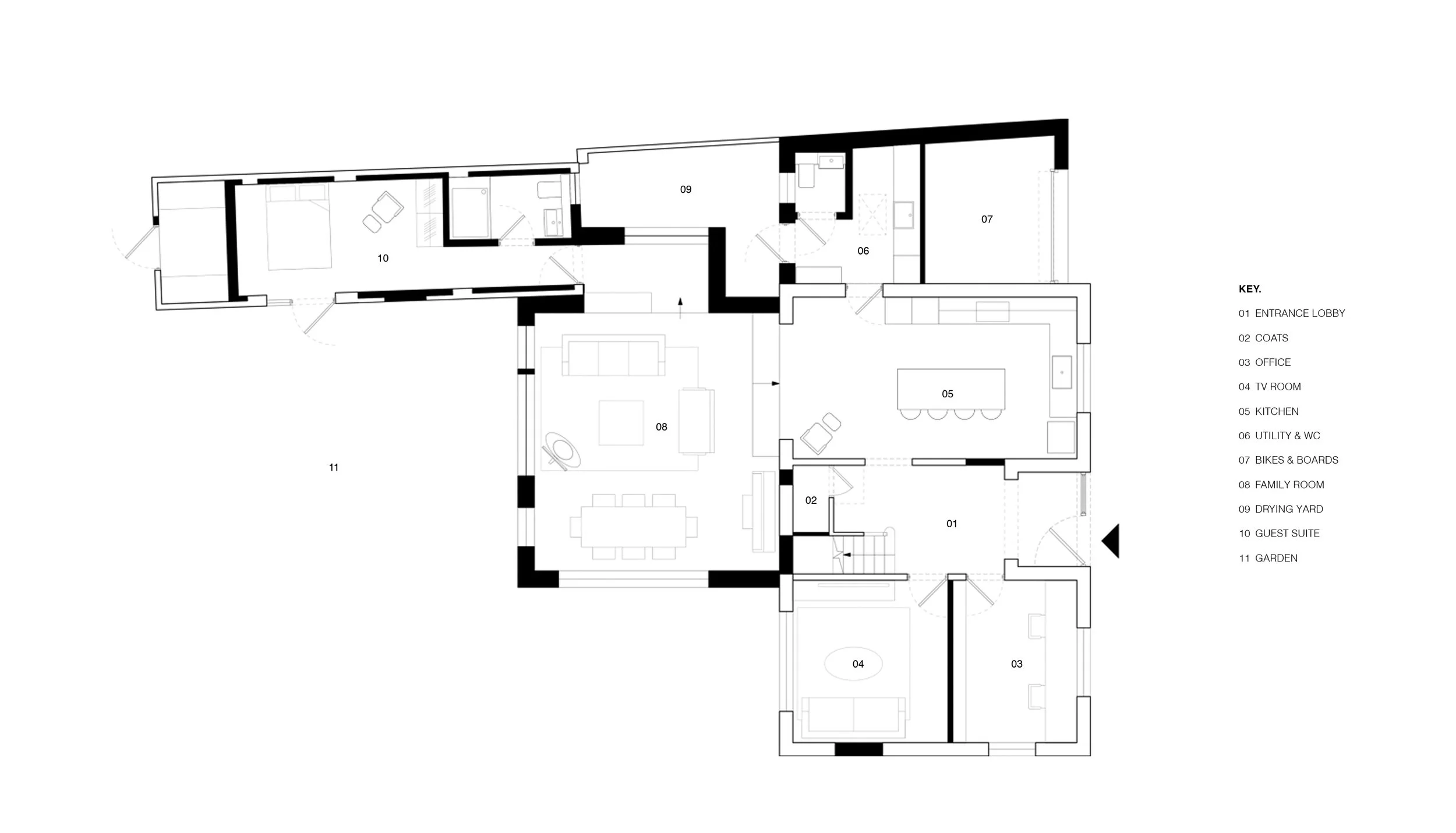 The internal layout was rethought to improve flow, while a rear extension fills the family room with natural light. A garage conversion provides a flexible guest suite, and a side extension adds a utility area - including a clever enclosed drying yard - and dedicated storage for bikes and boards at the front.
